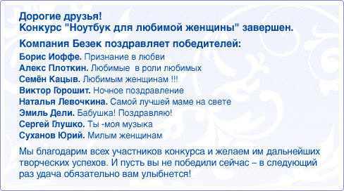 Борис Иоффе. Признание в любви Алекс Плоткин. Любимые  в роли любимых Семён Кацыв. Любимым женщинам !!! Виктор Горошит. Ночное поздравление Наталья Левочкина. Самой лучшей маме на свете Эмиль Дели. Бабушка! Поздравляю! Сергей Глушко. Ты -моя музыка: Суханов Юрий. Милым женщинам: